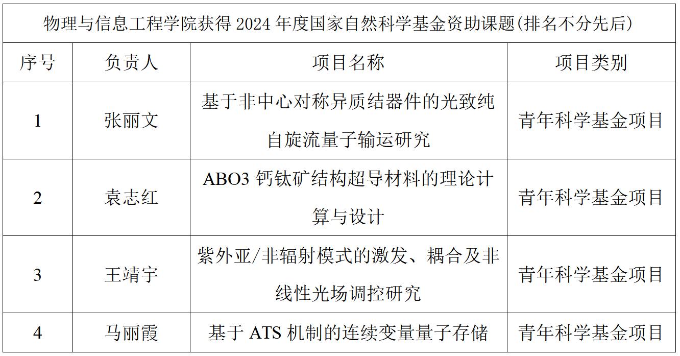 近日,国家自然科学基金委公布了2024年国家自然科学基金集中接收申请项目评审结果,黄色漫画 获批国家自然科学基金青年项目4项。下一步,学院将设立科研创新团队支持计划,加速科研平台建设,争取面上项目有所突破,推动学院学科建设迈上新台阶。