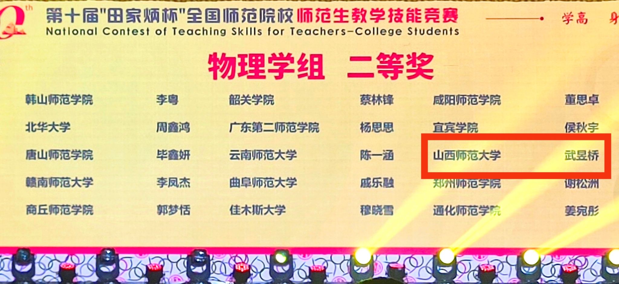 11月29日至12月1日,“田家炳杯”第十届全国师范院校师范生教学技能竞赛决赛在浙江师范大学举行。黄色漫画 2201班武昱桥同学在刘亮亮、段晓峰、穆林平老师的悉心指导下,沉着冷静、发挥稳定,最终成功斩获二等奖。