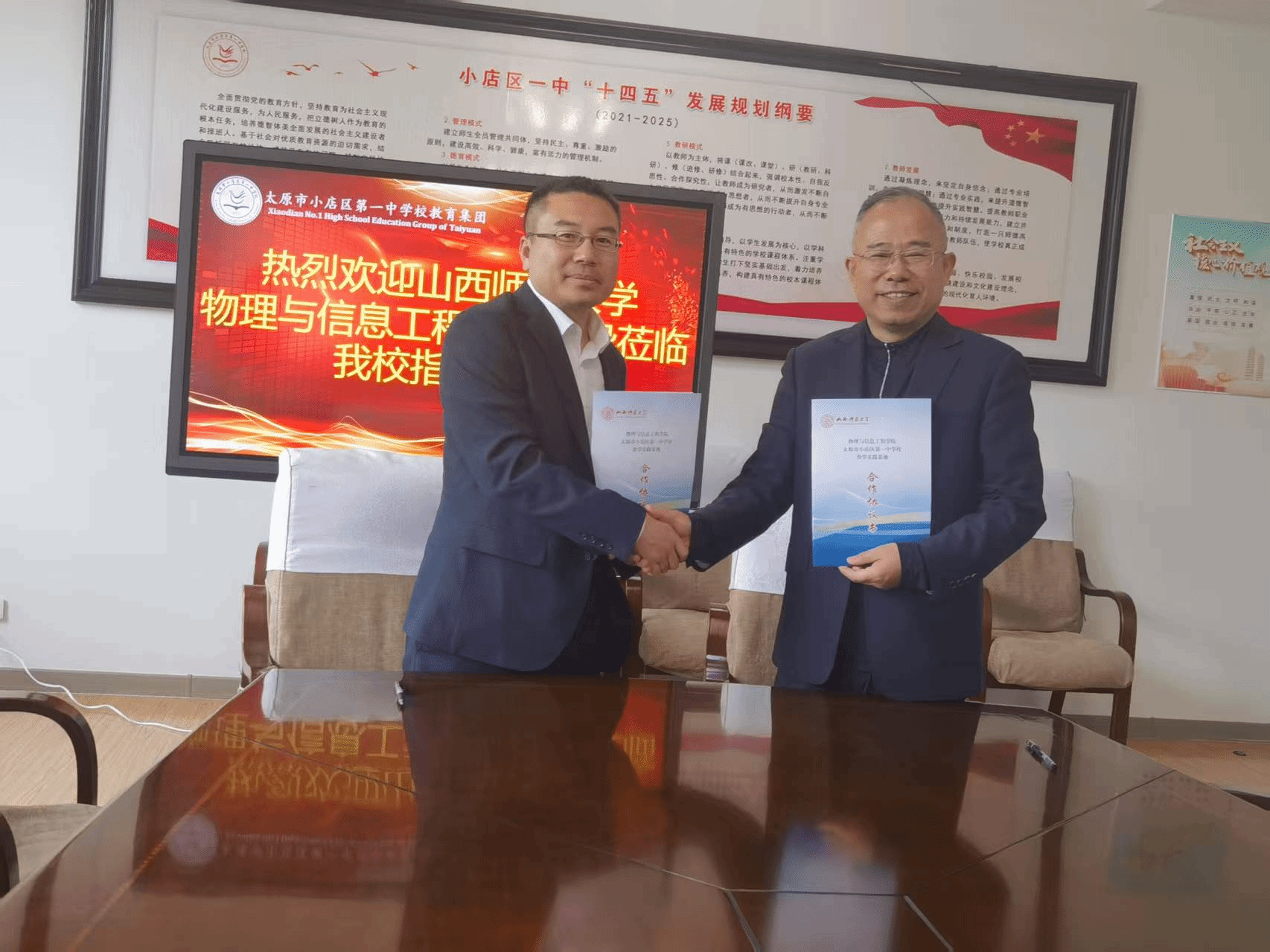 4月21日,黄色漫画 与太原市实验中学、太原市小店区第一中学分别举行了实习基地签约仪式。黄色漫画 副院长李俊生、物理实验室主任赵承祥、校友办主任马荣荣,太原市实验中学党委书记马宝峰、校长刘琦、副校长陈朝阳、太原市小店区第一中学校长闫耀明等中学领导出席了签约仪式。