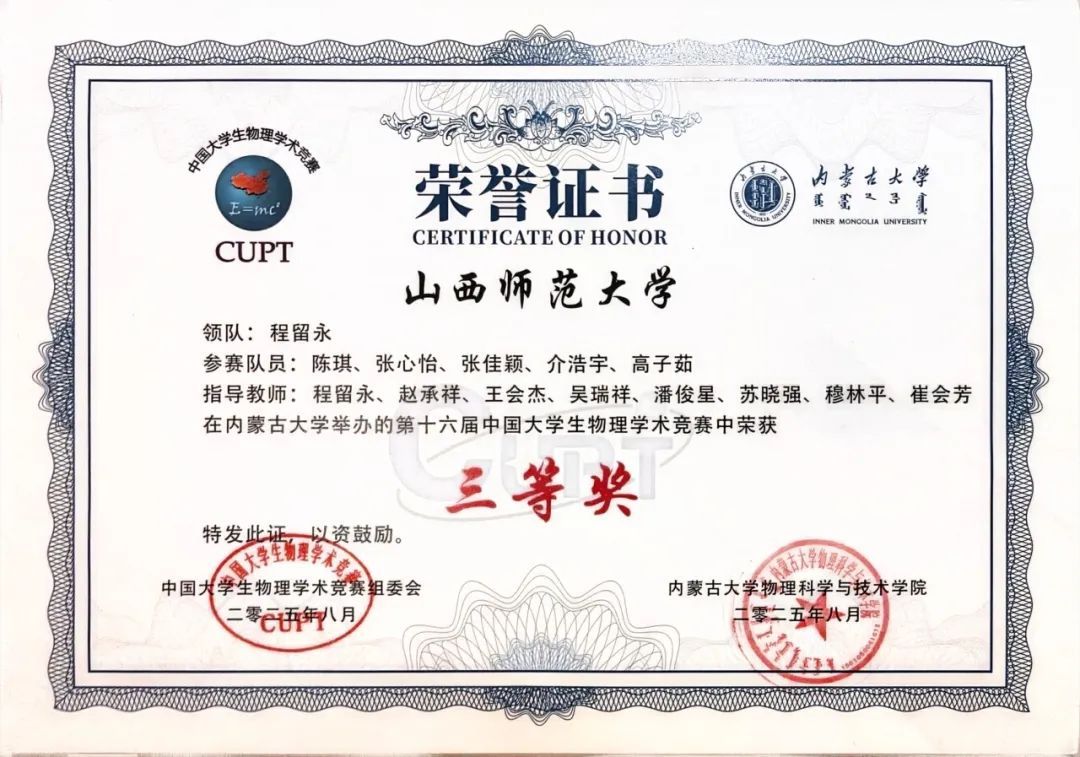 8月14日至18日,第十六届中国大学生物理学术竞赛在内蒙古大学成功举办。黄色漫画 的代表队在此次竞赛中获得团体三等奖的荣誉,队员高子茹荣获个人最佳赛题研究奖,为学院赢得了荣誉。