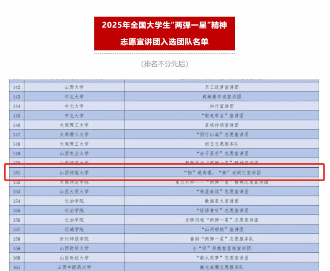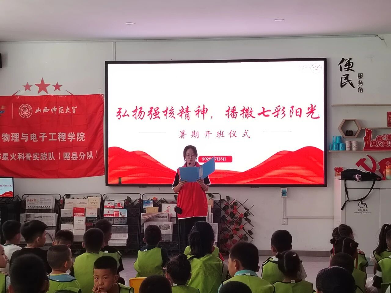 目前“物”说有理,“核”光同行宣讲团已走进隰县第一中学、隰县昕水社区开展了“两弹一星”宣讲实践活动,通过实验与宣讲融合的方式,让同学们在科技实操中感悟“两弹一星”精神。236普语飞扬实践队已奔赴汾西县,面向当地学前儿童、青少年、劳动力、基层干部等,围绕国家通用语言文字推广普及主线,开展“推普+”系列特色活动,为乡村振兴注入语言力量。
