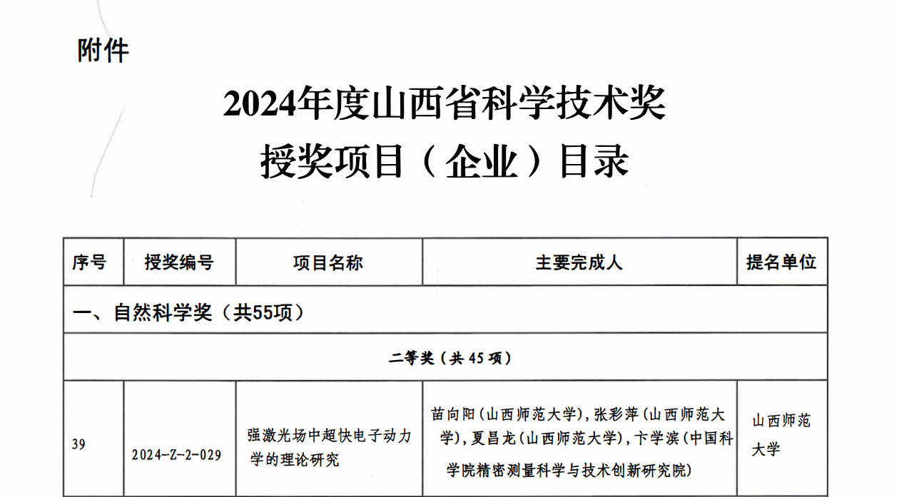 近日,山西省2024年度科学技术奖评选结果正式公布,黄色漫画 苗向阳教授团队完成的《强激光场中超快电子动力学的理论研究》项目,荣获山西省自然科学奖二等奖。