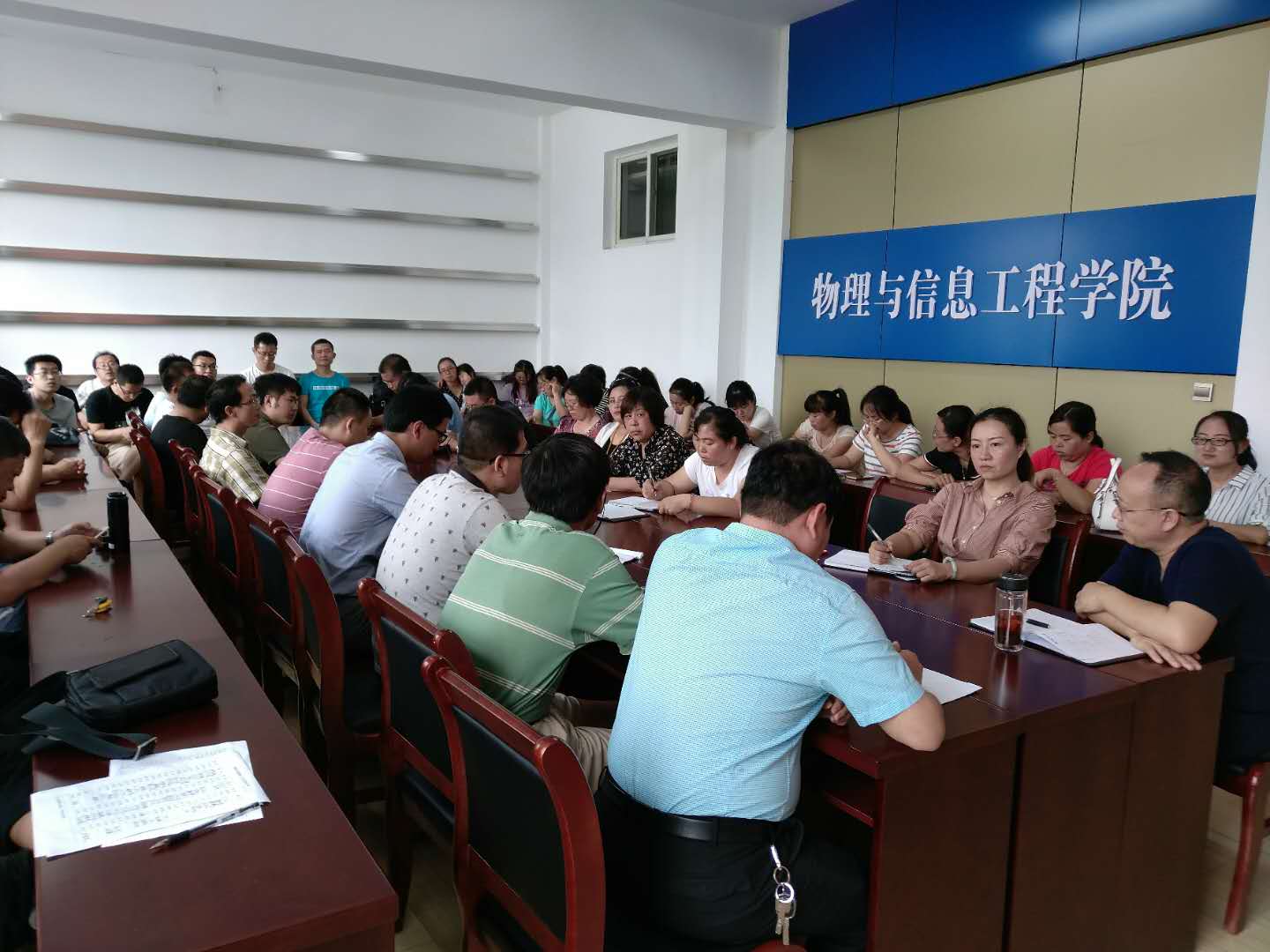 首先,院党委书记陈向波对假期的三项主要工作完成情况及取得的成效进行了通报。一是改善了师生工作学习的环境,按规定在学院现有办公室的基础上完成了教学档案室、综合档案室、教师休息室、师生交流空间的建设工作。对二层会议室进行了整修,使其具有了各类会议、示范教学、学生竞赛、进人试讲、党团活动、学术报告、荣誉展厅、来宾接待、校友聚会等多种功能;二是组织学生参加了三项大赛并取得了优异的成绩,包括全国第十届大学生与研究生物理教学技能与培养经验交流会获得16项国家级荣誉并获得优秀组织奖、首次参加第九届中国大学生物理学术竞赛并获得国家级团体三等奖、山西省2018年大学生电子设计竞赛20组作品进入省赛答辩阶段,优异成绩的取得是对我们学院“竞赛+”特色人才培养模式的又一次生动诠释。三是在国家基金和省“教学项目”申报方面成绩优异,包括成功获得5项国家自然科学基金项目和5项省教学项目立项资助。