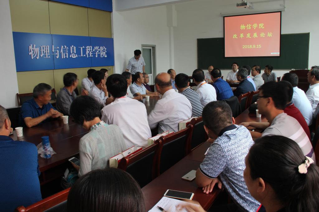 2018年9月15日上午11:00,黄色漫画 在四号楼二层多功能会议室举行了物信学院改革发展论坛。院党委书记陈向波、院长张进军、副院长张东海出席了论坛,老领导、老教师代表杨虎、杜启高和优秀校友代表、学院全体中层干部共60余人参加了论坛。论坛由院党委书记陈向波主持。