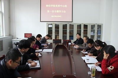 3月9日下午3时,物信学院党委中心组在四号楼一层会议室召开本学期第一次专题学习(扩大)会议,会议主题是“学习贯彻高校思想政治工作会议精神”。院领导吴文国、张进军、陈向波与系主任、院团委书记、各支部书记、院办公室负责人一起参加了学习。学习会议由院党委书记吴文国主持。