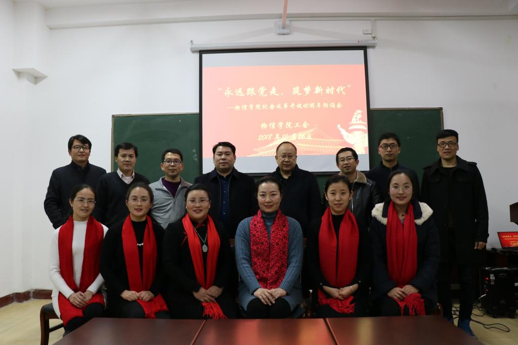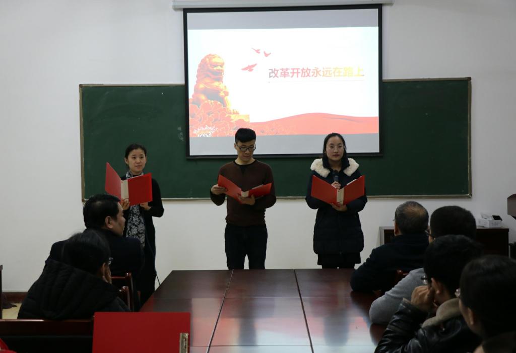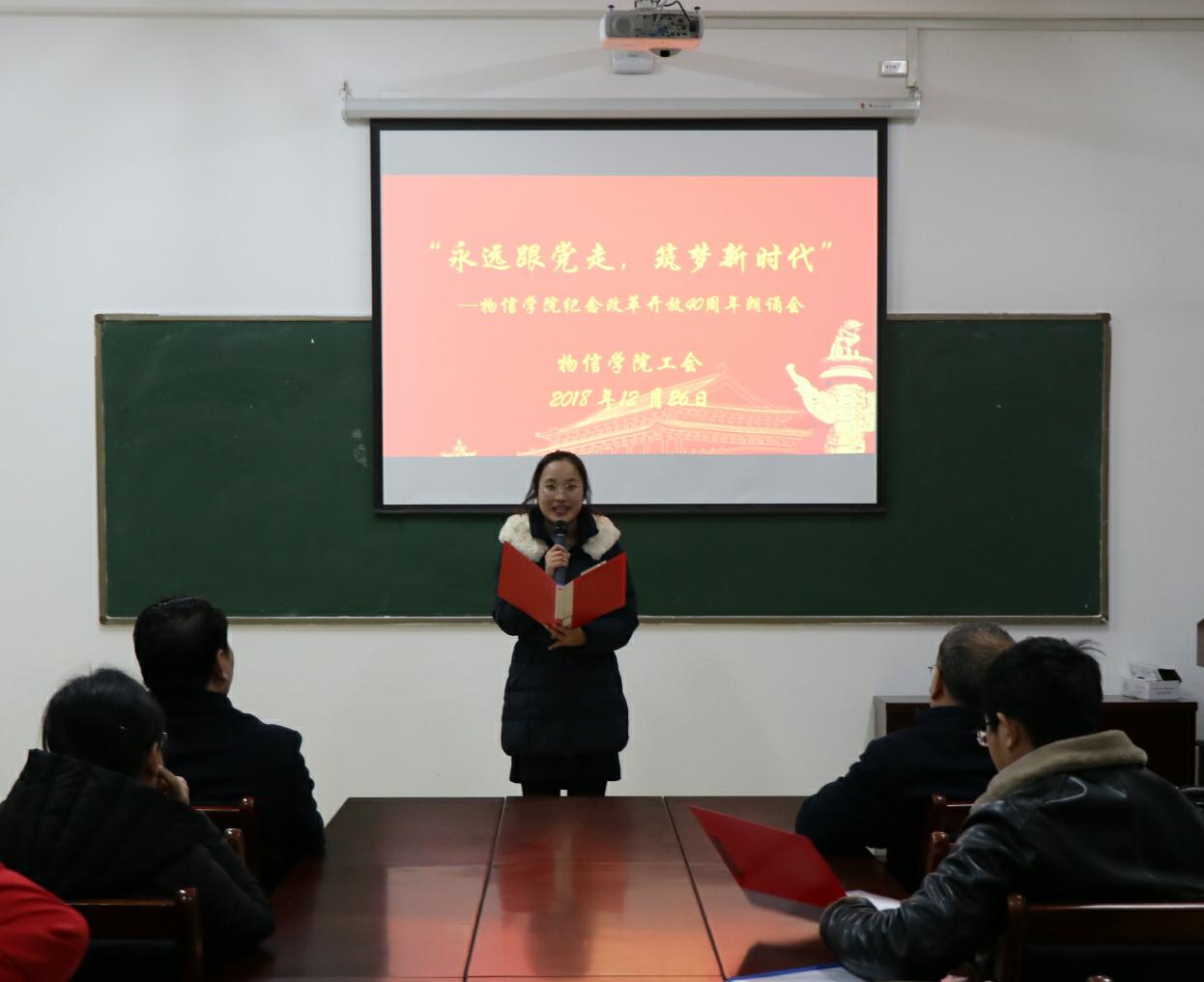2018年12月26日晚上7:00,黄色漫画 工会在四号楼二层多功能会议室举办“永远跟党走,筑梦新时代——物信学院庆祝改革开放40周年朗诵会。”院党委书记陈向波、院长张进军出席朗诵会现场,学院教职工参加了朗诵。朗诵会由马丽娜老师主持。