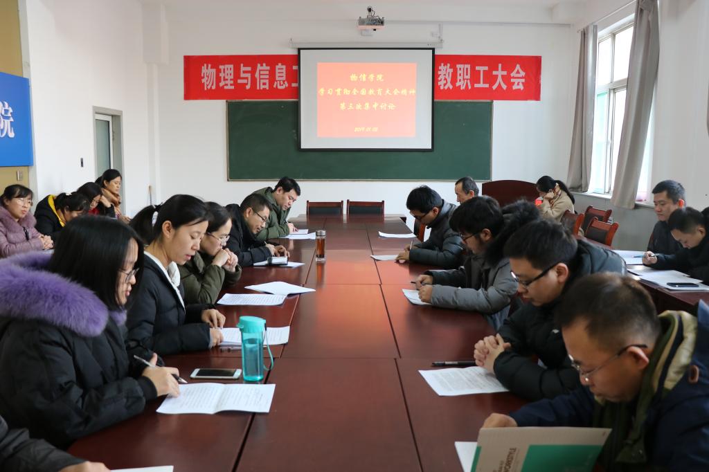 2019年1月2日下午3:00,黄色漫画 在四号楼二层多功能会议室召开了学习贯彻全国教育大会精神第二次、第三次集中讨论会议。12个小组的24名教师代表分别代表本组参加学院第二次和第三次集中讨论会议,会议由院党委书记陈向波主持。