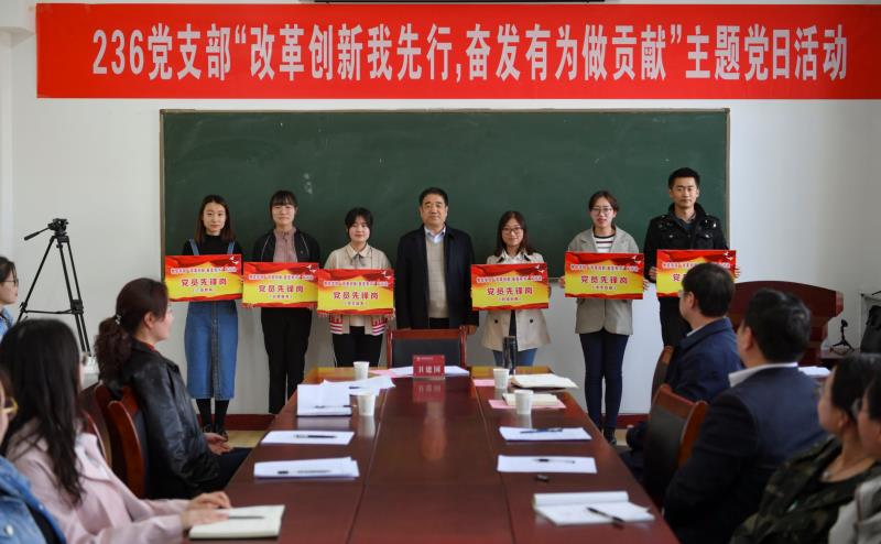 为了使全体党员提高认识、对标先进、主动作为,236支部专门设立了“改革创新、奋发有为”大讨论党员先锋岗,包括三信教育先锋岗、志愿服务先锋岗、学生宿舍先锋岗、科技创新先锋岗、学术竞赛先锋岗和校园文化先锋岗。校党委书记卫建国为“改革创新、奋发有为”大讨论党员先锋岗代表进行了授牌。