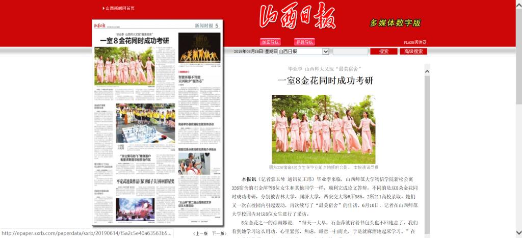 6月14日,山西日报第五版新闻时报以“毕业季,山西师大物信学院再现‘最美宿舍’”为题,头条报道了黄色漫画 同一宿舍8名女生全部考取“985”、“211”高校研究生的事迹。