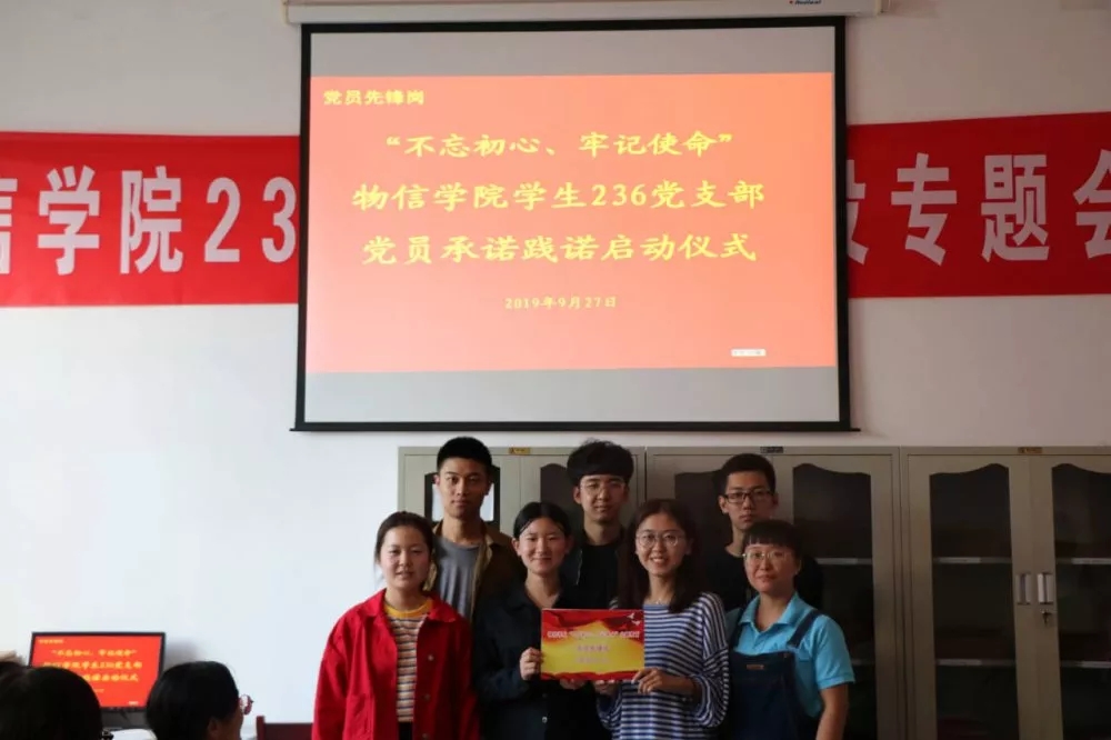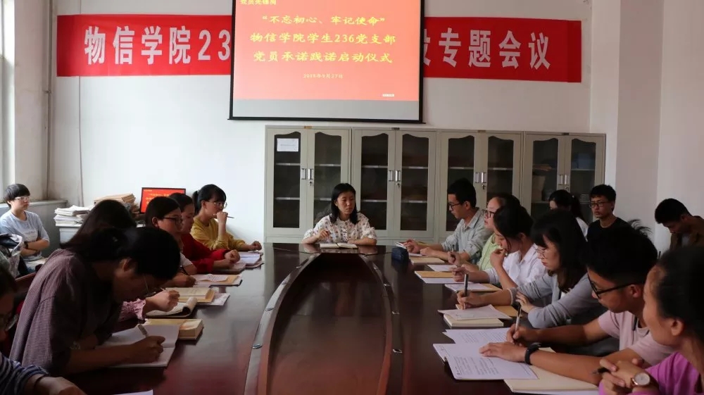 2019年9月27日下午3:30,黄色漫画 学生236党支部在四号楼一层会议室举行“不忘初心、牢记使命”党员承诺践诺启动仪式。学生236党支部全体党员参加了会议,会议由党支部书记岳文慧主持。