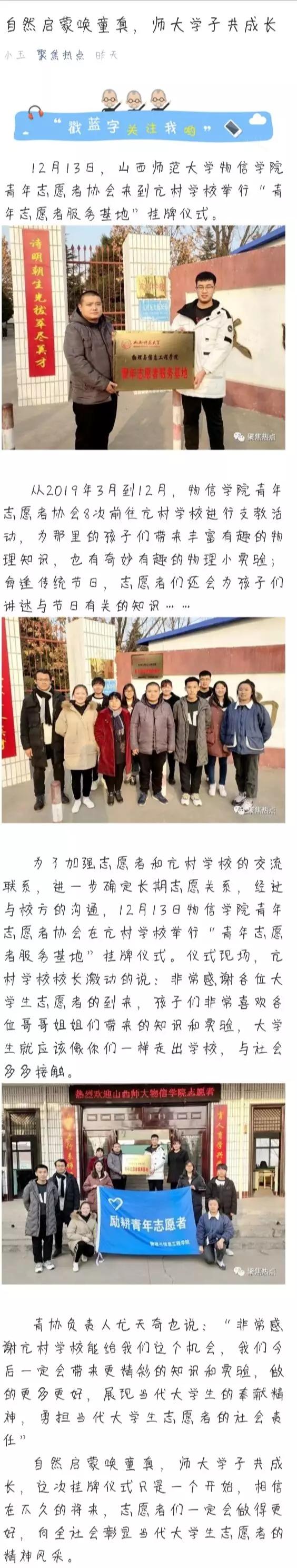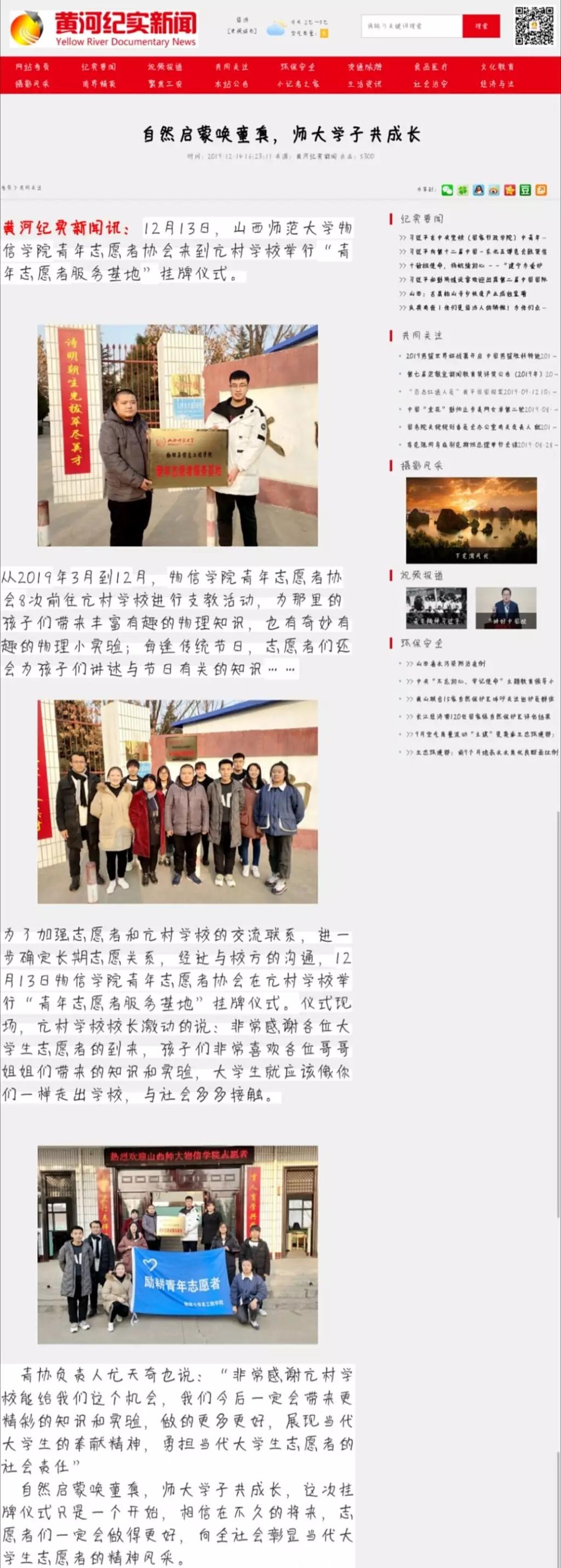 2019年12月14日,黄河纪实新闻网、聚焦热点公众号均以“自然启蒙唤童真,师大学子共成长”为题报道了黄色漫画 青年志愿者协会前往亢村学校举行“青年志愿者服务基地”挂牌仪式。(文/王豆)