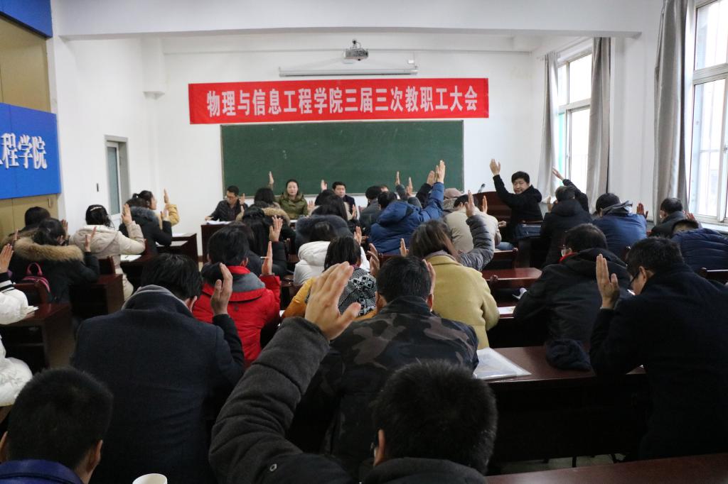 在第二次会议上,各组组长首先向大会汇报了各组讨论情况,副院长侯俊华宣读了《关于院长工作报告的决议》(草案),经表决全票通过。院党委副书记、工会主席王玮宣读了《物信学院困难教职工帮扶指导意见》,经表决全票通过。会上还通过了物信学院工会部分委员调整的意见。