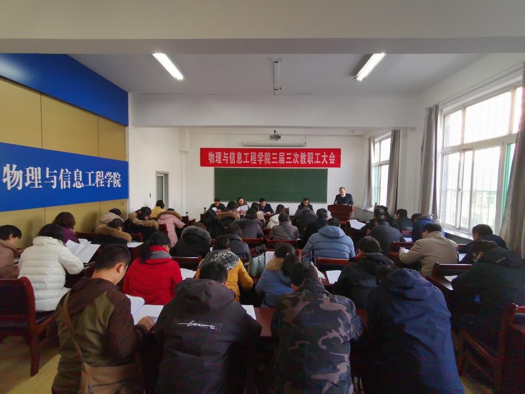 会上,张进军院长代表学院向大会作了题为《不忘初心接续奋斗谋发展 立德树人砥砺奋进谱新篇》的报告。他首先对黄色漫画 2019年工作进行了汇报总结。他指出,即将过去的2019年,是新中国成立70周年,也是黄色漫画 实现“十三五”规划各项任务落地生根的一年,更是黄色漫画 各项改革发展深化落实、成果丰硕的一年。一年来,黄色漫画 在校党委和校行政的正确领导下,在学校各职能部门的大力支持下,在院领导班子的高效带领下,在学院全体师生员工的凝心聚力下,全体“物信人”高举习近平新时代中国特色社会主义思想伟大旗帜,全面深入贯彻党的十九大、十九届四中全会精神,紧紧围绕立德树人根本任务,坚持以习近平总书记关于教育的重要论述为指引,始终坚守培养德智体美劳全面发展的社会主义建设者和接班人的育人使命;始终坚定为国家战略和社会经济发展服务的办学方向;始终坚持为山西基础教育服务的办学特色;始终奋斗在新时代一流学院建设的征程中。全力推动机制体制创新、扎实推进教育教学改革、大力保障教学科研并行、科学设置人才培养目标、全面培养学生矢志成才,各方面的工作都取得了长足的进步,收获了可喜的成绩,在黄色漫画 特色鲜明的高水平师范大学建设新征程中砥砺奋进,共同谱写了新时代物信学院改革建设发展的崭新篇章。他着重从学科管理、班子建设、本科教学审核评估整改工作、学术交流、科研成果、人才引进、人才培养、群体活动等方面用一串串详实的数据总结了黄色漫画 一年来取得的进步以及实质性发展:学院管理更加科学规范、班子建设更加坚强有力,工作作风更加严谨务实、团结协作更加优质高效;围绕人才培养的“五个度”和“二十字”评估方针,完成了本科教学审核评估整改工作;科研氛围愈加浓郁、学术交流频繁活跃,学科建设稳步推进、科研成果产出丰硕;人才引进力度加大、引育并举效果显著,师资队伍更加充实、人才梯队更加合理;教育管理实现优化、服务能力逐渐提高,人才培养再结硕果、立德树人再谱新篇;师生员工凝心聚力、精彩绽放物信精神,群体活动勇创辉煌、精神文明全面丰收。最后,张院长从教学改革力度、科学研究水平、学科团队建设、专业建设能力、人才培养质量、人才引育进度、工作成效评价等角度出发提出过去一年存在的困难和问题。他指出,2020年黄色漫画 工作的指导思想是继续高举习近平新时代中国特色社会主义思想的伟大旗帜,全面深入贯彻落实党的十九大精神和十九届四中全会精神,在习近平总书记关于教育的重要论述指引下,以立德树人为根本任务、以本科教学为中心、以博士点建设为引领,狠抓创新、强化特色、打造知名、争创一流,继续推动新时代一流学院建设再上新台阶!此外,他还对2020年工作进行进一步展望。继续坚持立德树人,强化思想引领,全面提高人才培养质量;继续深入推进“平行授课机制”,加大课堂教学改革多维度,提升本科教学质量;继续加大高层次人才引育力度,加强教师职业培养,推动师资队伍建设新发展;继续加强学科建设,以博士点建设为突破口,实现学院发展迈上新台阶。