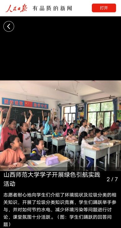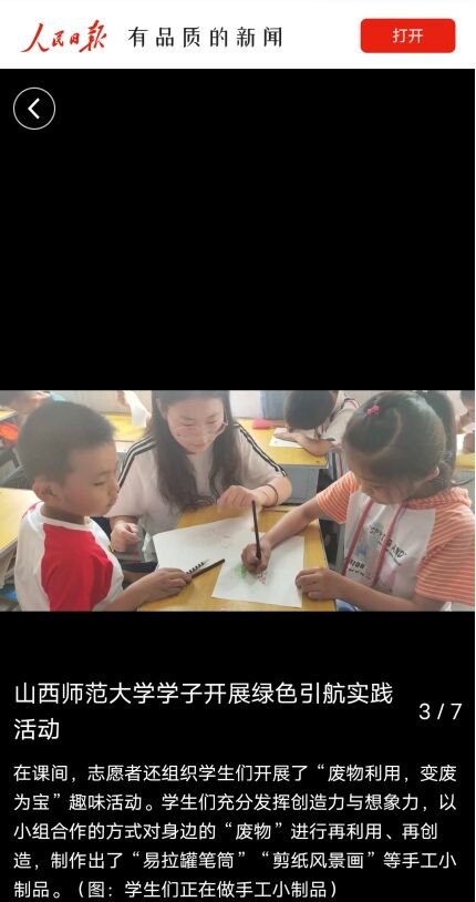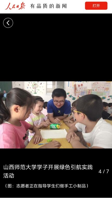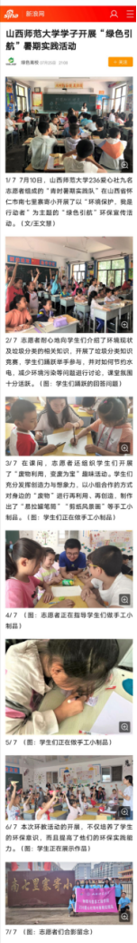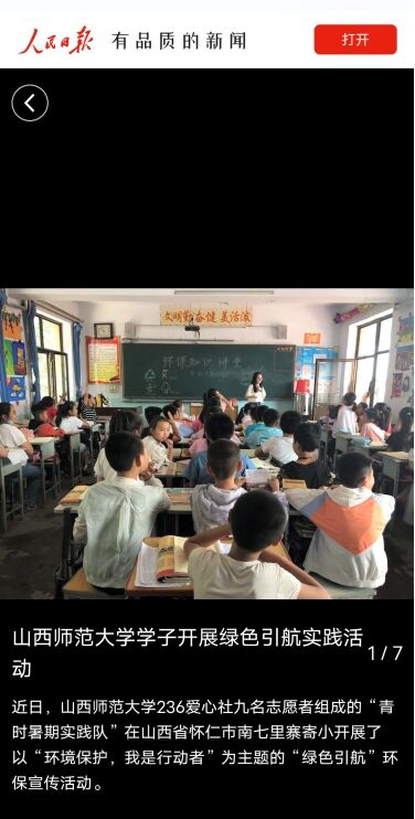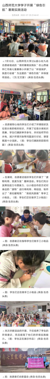 7月25日,人民日报、腾讯新闻和新浪新闻客户端分别以“黄色漫画 学子开展绿色引航实践活动”、“黄色漫画 学子开展‘绿色引航’暑期实践活动”为题,分别报道了黄色漫画 236爱心社青时暑期实践队在山西省怀仁市南七里寨寄小开展的“绿色引航”环保宣传活动。