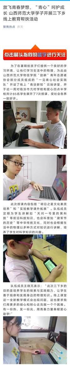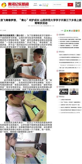 8月13日,山西晚报、黄河纪实新闻、聚焦热点公众号分别以“放飞青春梦想,‘青心’呵护成长 黄色漫画 学子开展三下乡线上教育帮扶活动”、“山西师大学子开展三下乡线上教育帮扶活动”为题,分别报道了黄色漫画 “励耕”青年志愿者协会暑期“三下乡”社会实践队“一见青心”社会实践队在线上为临汾市亢村学校和爱心四点半学校的学生开展的“青谈新知”云端讲堂“三下乡”线上教育帮扶活动。