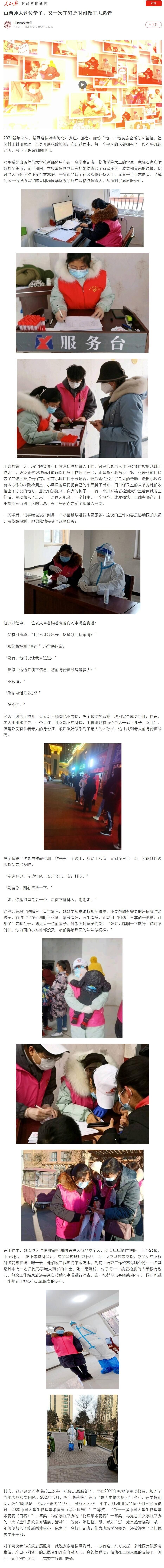 在以习近平同志为核心的党中央坚强领导下,我国疫情防控取得重大战略成果,疫情总体得到有效控制,但反弹风险丝毫不能忽视。近期,境外疫情持续扩散蔓延,我国多地发生局部聚集性疫情。疫情就是命令,防控就是责任,大家都在为疫情防控做着自己力所能及的贡献。近日,人民日报客户端、《山西师大报》分别报道了黄色漫画 学子冯宇曦参加石家庄疫情防控志愿服务的事迹,引起了广大师生的热切关注和高度称赞。