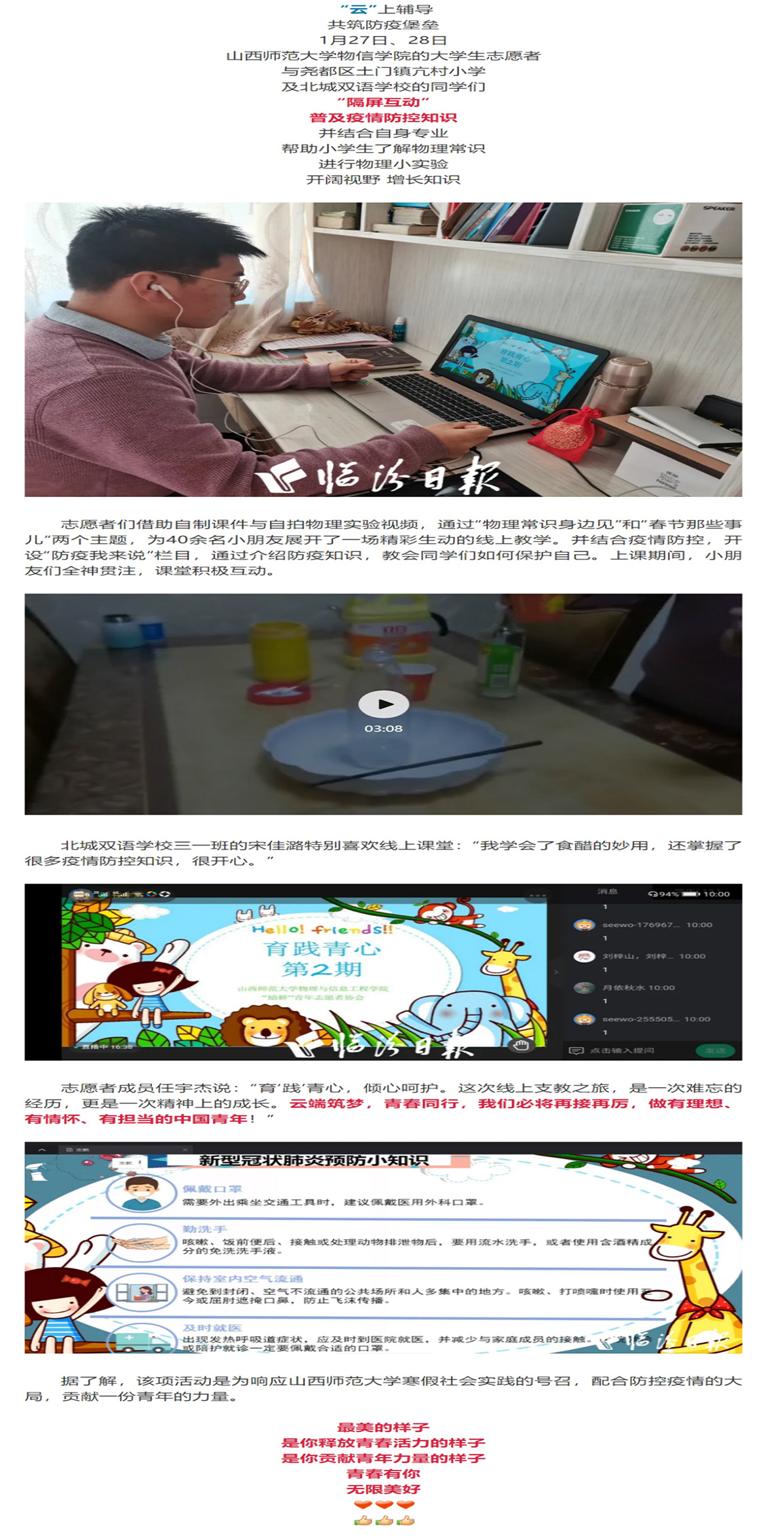 黄河纪实新闻网、临汾日报分别于1月29日、1月31日以“云端筑梦,青春同行 山西师大志愿者为小学生线上‘云’辅导”“山西师大志愿者,好样的!”为题报道了黄色漫画 寒假社会实践队——育践青心小分队为亢村小学以及北城双语学校的小朋友们进行的线上“云”辅导活动。
