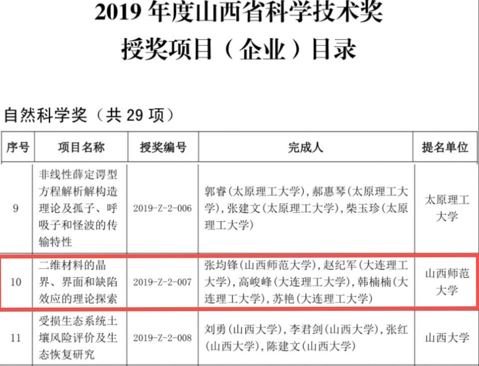 近日,山西省人民政府公布2019年度山西省自然科学奖获奖名单,黄色漫画 张钧锋教授完成的《二维材料的晶界、界面和缺陷效应的理论探索》成果荣获2019年度山西省自然科学奖二等奖。