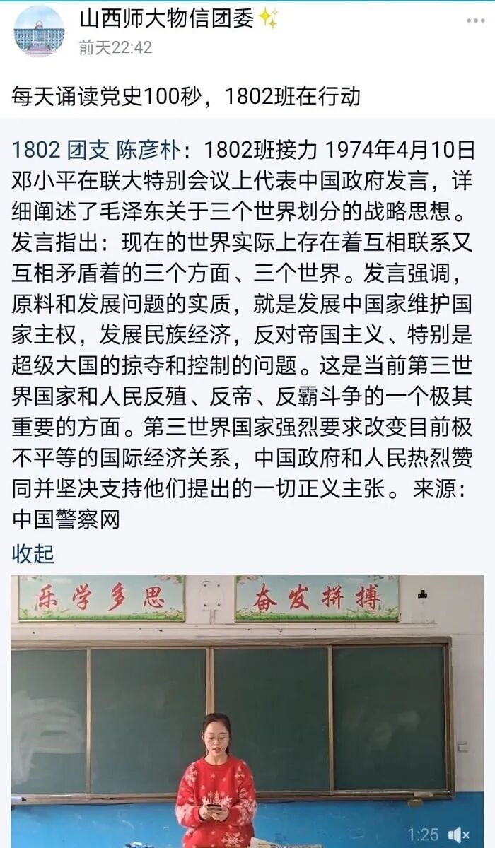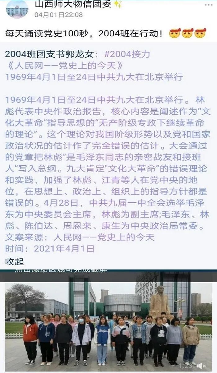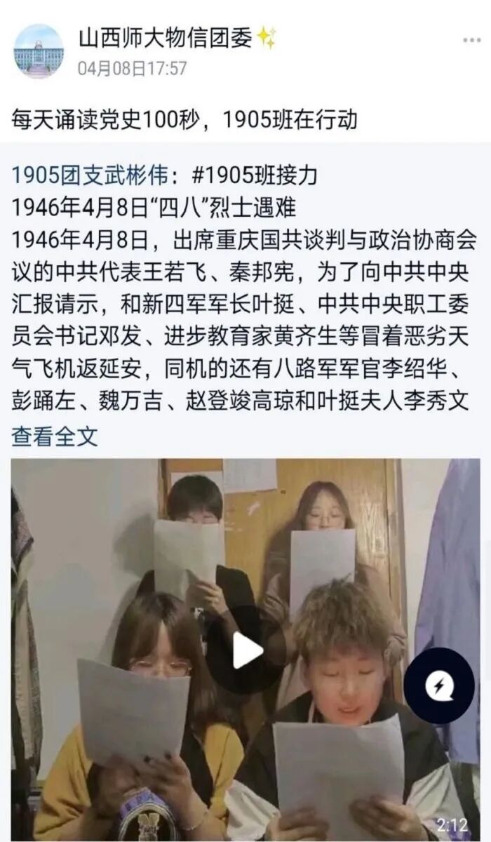 为更好地激励大学生重温党的光辉历史,3月29日,黄色漫画 团委学生会组织大一至大三各班开展了“每天100秒,回眸100年”的接力诵读活动,截至4月15日已经完成第一轮接力,历时18天,共有18个班参与。此次接力活动将持续开展2021年全年。