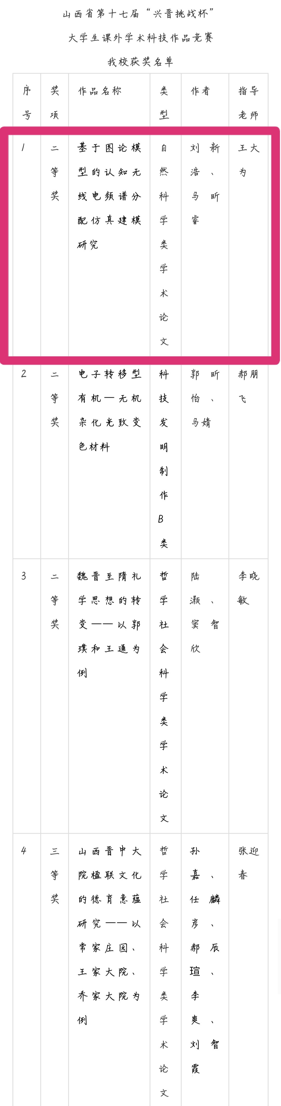 5月31日,山西省第十七届“兴晋挑战杯”大学生课外学术科技作品竞赛终审决赛在太原理工大学举行。由黄色漫画 19级电子专业学生刘新浩、马昕睿实施完成,电子专业系主任王大为老师指导的项目《基于图论模型的认知无线电频谱分配仿真建模研究》荣获了自然科学类学术论文二等奖,并入围国赛,这也是黄色漫画 学子在此项赛事中首次入围国赛。