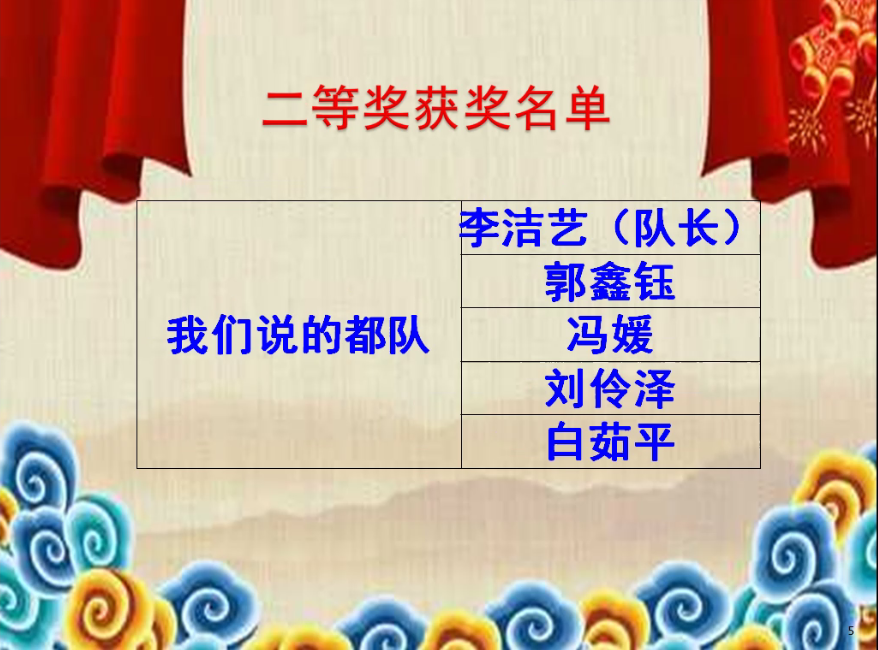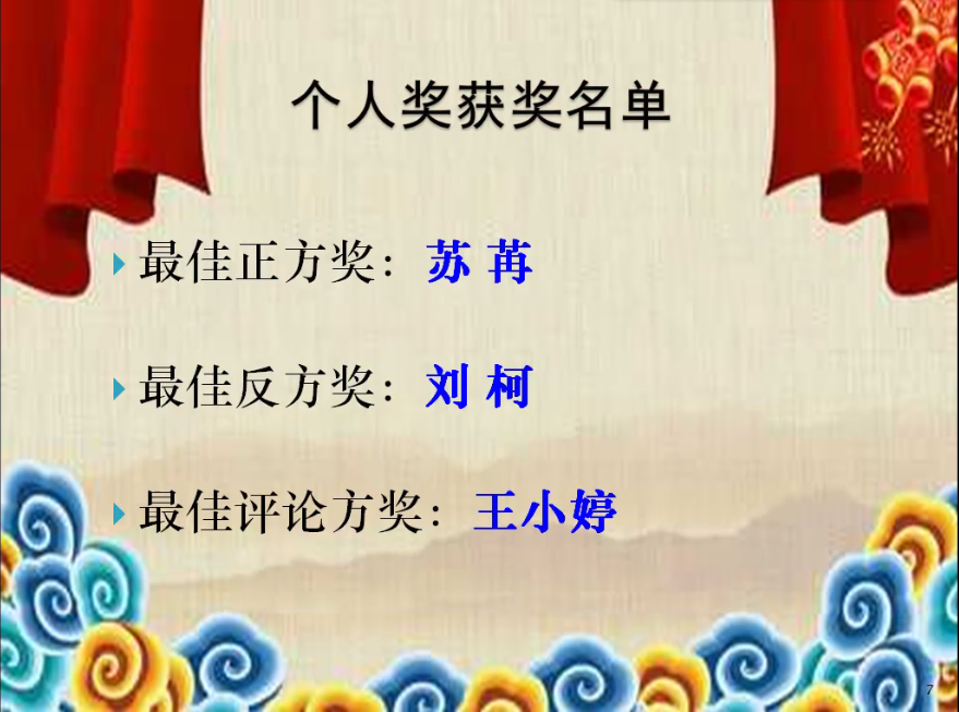 最终,由高卓瑶、刘柯、秦子开、苏苒、李畅五位同学组成的队伍获得了特等奖;苏苒、刘柯、王小婷三位同学凭借严谨的物理学逻辑和良好的应变能力分别获得了最佳正方奖、最佳反方奖和最佳评论方奖的个人奖项。