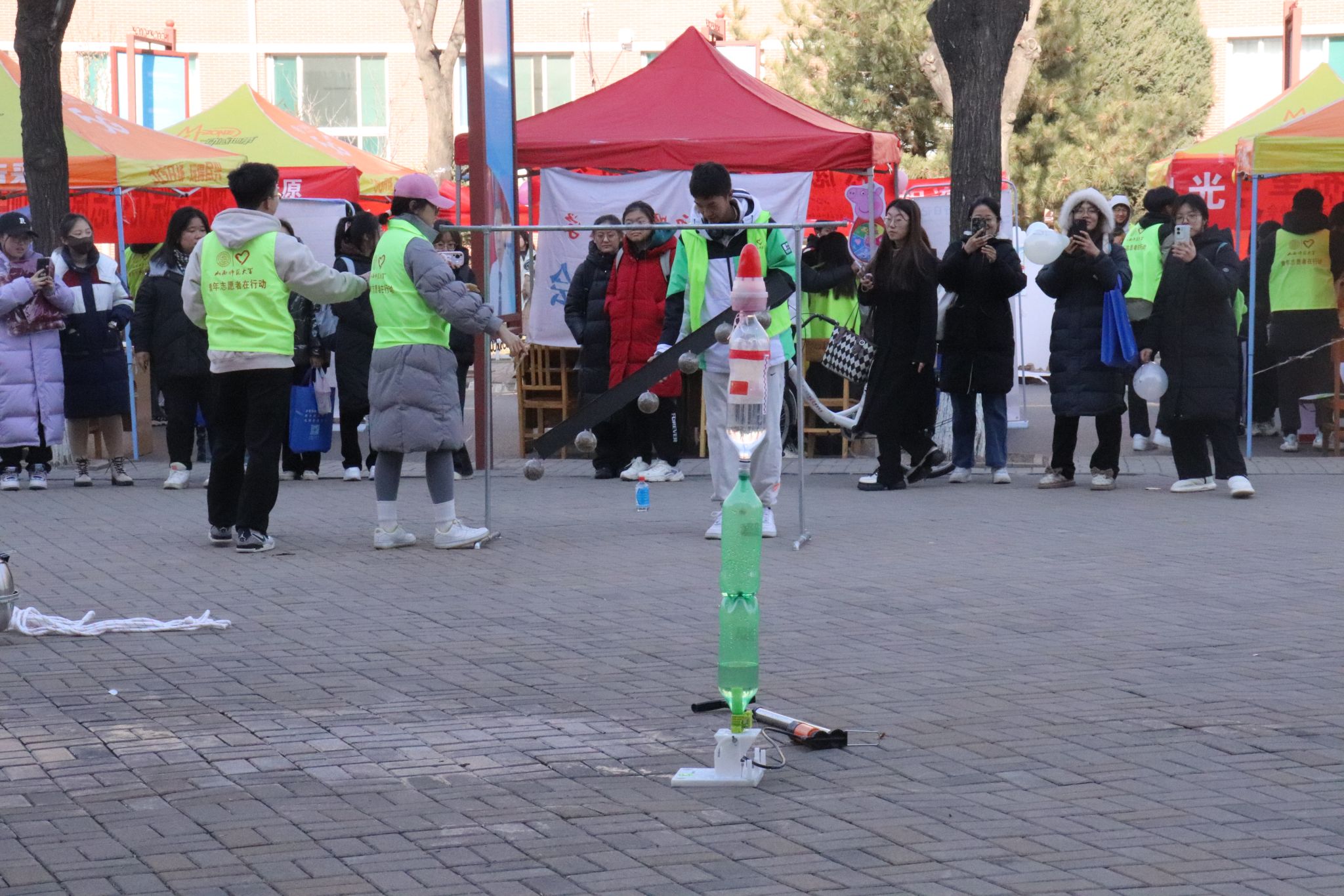 在本次活动中,志愿者展示了四种趣味物理实验,分别为水火箭、蛇形摆、空气炮和马德堡半球实验。同学们对此十分好奇,积极上前参与实验,欢呼声此起彼伏,现场其乐融融。不仅如此,志愿者们还准备了“学富五车”和“你画我猜”两种小游戏,也吸引了不少同学参与其中。
