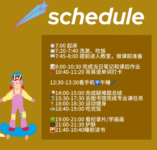 为号召同学们合理规划时间,鼓励同学们通过制作自律时间表的形式加强自我监督意识,黄色漫画 自律部于4月8日至4月12日举办“‘易’起寻找,‘律’色时光”自律时间表制作活动。