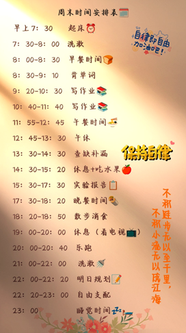 本次活动自开始以来,受到了广大学生的积极参与。大家根据自己的实际情况,制定出切实可行的自律时间表,以培养良好的学习习惯和生活作息。活动期间,同学们纷纷晒出了自己的自律时间表,分享了制定过程中的心得体会。有的同学选择早起晨读,用知识的力量开启新的一天;有的同学则选择晚上自习,将白天的时间用于运动和社交。每个人的时间表都独一无二,但都透露出对自律的执着追求。