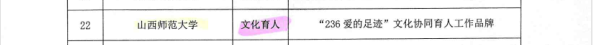 2018年以来,在校党委的高度重视下,236品牌走向全国的步伐大大加快,一系列突破性的、历史性的、标志性的成果捷报频传,当初制定的“学校闻名、山西知名、全国有名”的战略目标已经成为现实:236的优秀事迹得到了《人民日报》、《中国教育报》和中央电视台等国家级媒体的长篇深度报道;236爱心社入选了全国高校“十大最佳学生社团”,获得“山西青年五四奖状”荣誉称号;236党支部入选了教育部“十大推荐展示精品成果”和首批“全国党建工作样板支部”;“236文化协同育人项目”入选教育部第二批高校思想政治工作精品项目;物信学院入选山西省首批“三全育人”综合改革试点院(系),入选教育部第二批“三全育人”综合改革试点申报单位资格审核通过名单,进入遴选环节。