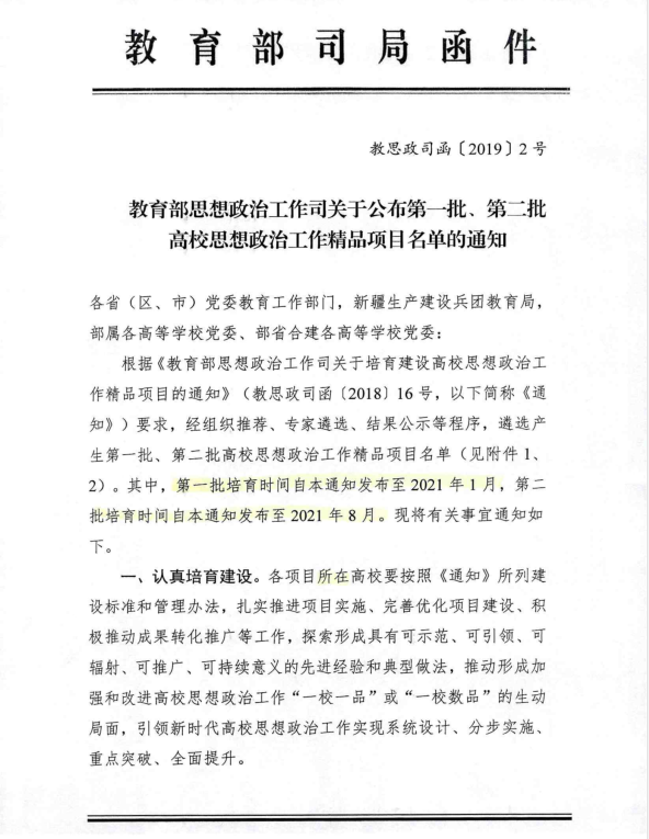 据悉,高校思想政治工作精品项目是教育部思想政治工作司首次评选的思政类重点工作项目,旨在深入学习贯彻习近平新时代中国特色社会主义思想和党的十九大精神,推进全国高校思想政治工作会议精神落地见效,促进高校思想政治工作质量提升工程深入实施,在落实“三全育人”和一体化构建“十大”育人体系方面,探索形成具有可示范、可引领、可辐射、可推广、可持续意义的先进经验和典型做法,推动形成加强和改进高校思想政治工作“一校一品”或“一校数品”的生动局面,引领新时代高校思想政治工作实现系统设计、分步实施、重点突破、全面提升。