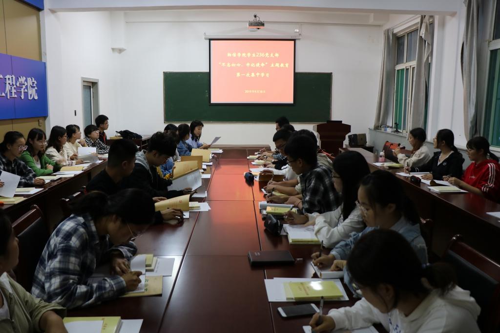 2019年9月18日,黄色漫画 学生236党支部在四号楼二楼多功能会议室举行“不忘初心、牢记使命”主题教育第一次集中学习。支部全体党员参加了活动。
