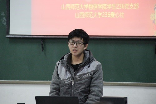 最后是236爱心社干事代表曹海波发言谈立党为公、忠诚为民的奉献精神。曹海波同志结合暑期三下乡去吉县支教的经历,讲述了支教的苦于累,乐与甜,条件的艰苦并不能改变每一位支教者内心的热情,当看到孩子们一双双明媚的眼眸时,所有的累都是幸福的。