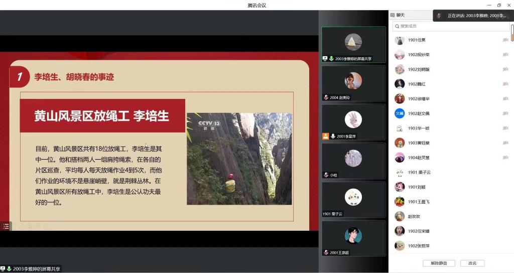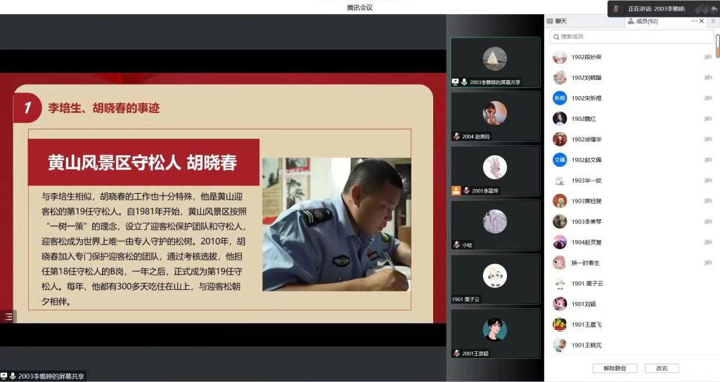 活动中,支部党员怀着无比崇敬的心情一起观看了黄山风景区放绳工李培生和黄山风景守松人胡晓春的感人事迹,当看到李培生在悬崖峭壁和荆棘丛林中进行放绳作业、胡晓春十年来只为守护一颗松时,对他们的敬佩之情油然而生。交流发言环节,支部党员李星萍说道,他们有着强大的道德感召力和高尚的人格魅力,在日常工作生活中默默付出,从身边做起、从小事做起,对家人、对事业、对社会、对国家满怀朴素而深沉的爱,作为一名学生党员,必须向他们学习,学习他们的身体力行,学习他们的坚守担当。