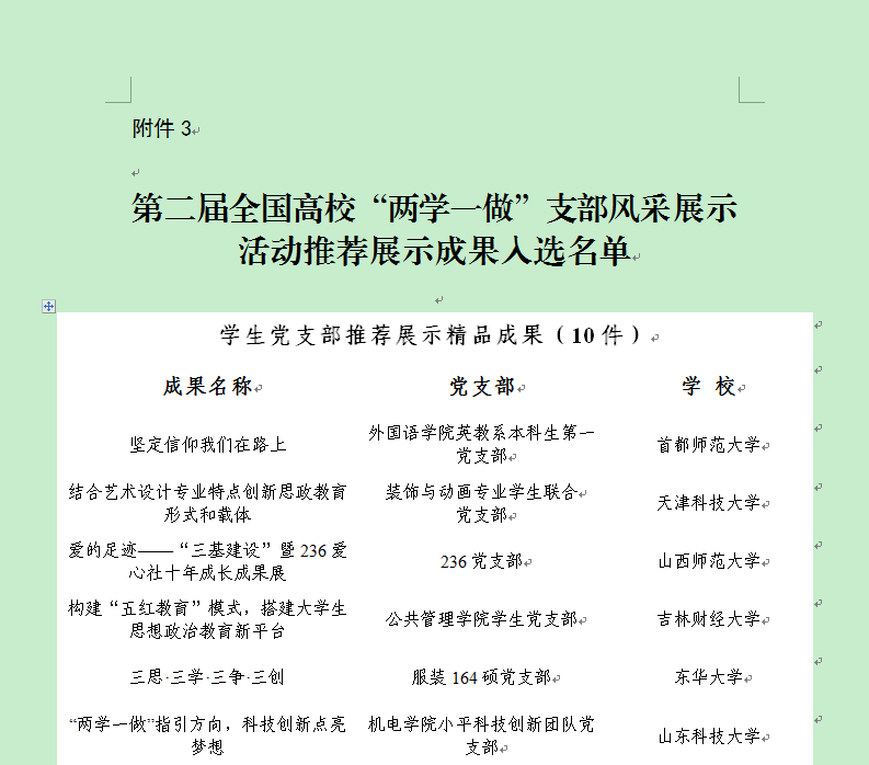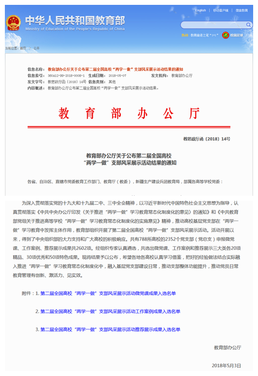物信学院学生236党支部“爱的足迹——‘三基建设’暨236爱心社十年成长成果展”入选第二届全国高校“两学一做”支部风采展示活动推荐展示成果之学生党支部推荐展示精品成果,位列全国十强。