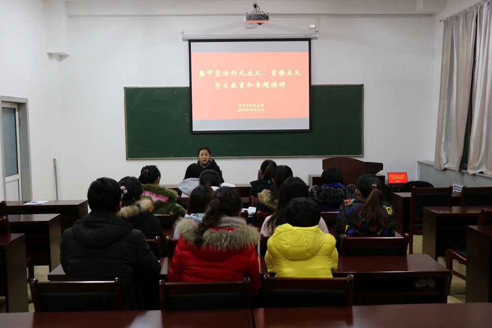 学生236党支部在四号楼二层多功能会议室召开“集中整治形式主义、官僚主义学习教育和专题调研”会议。学生236党支部党员参加了会议,会议由党支部书记岳文慧主持。