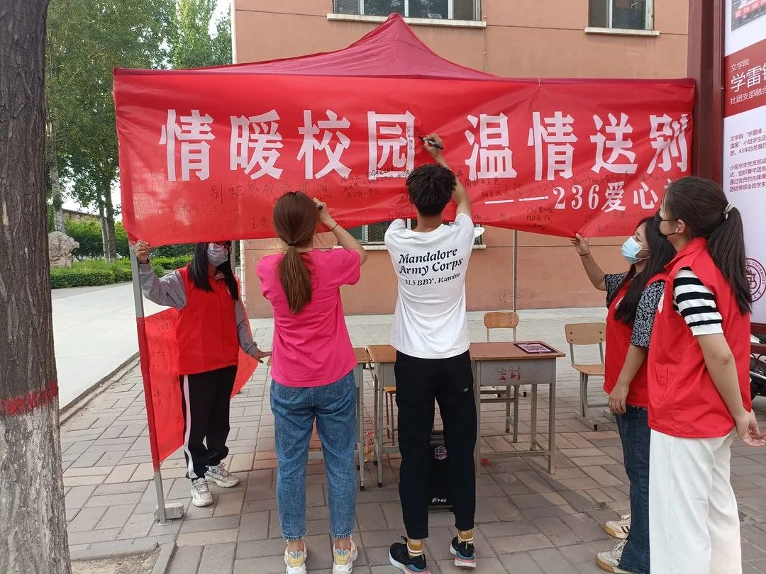 志愿服务期间,236爱心社招募志愿者在诚德大厦旁轮流值班,为毕业生提供咨询服务,并为他们提供力所能及的帮助,志愿者们还邀请毕业生在条幅上留下临别赠言,并附送定制的校园明信片,为他们送上校园回忆。校园里,志愿者们分成小组,根据提前统计的需要帮助的毕业生名单,为他们提供帮助,志愿者一次次往返于校门与宿舍楼之间,安全高效地将毕业生的行李搬运到校门口。