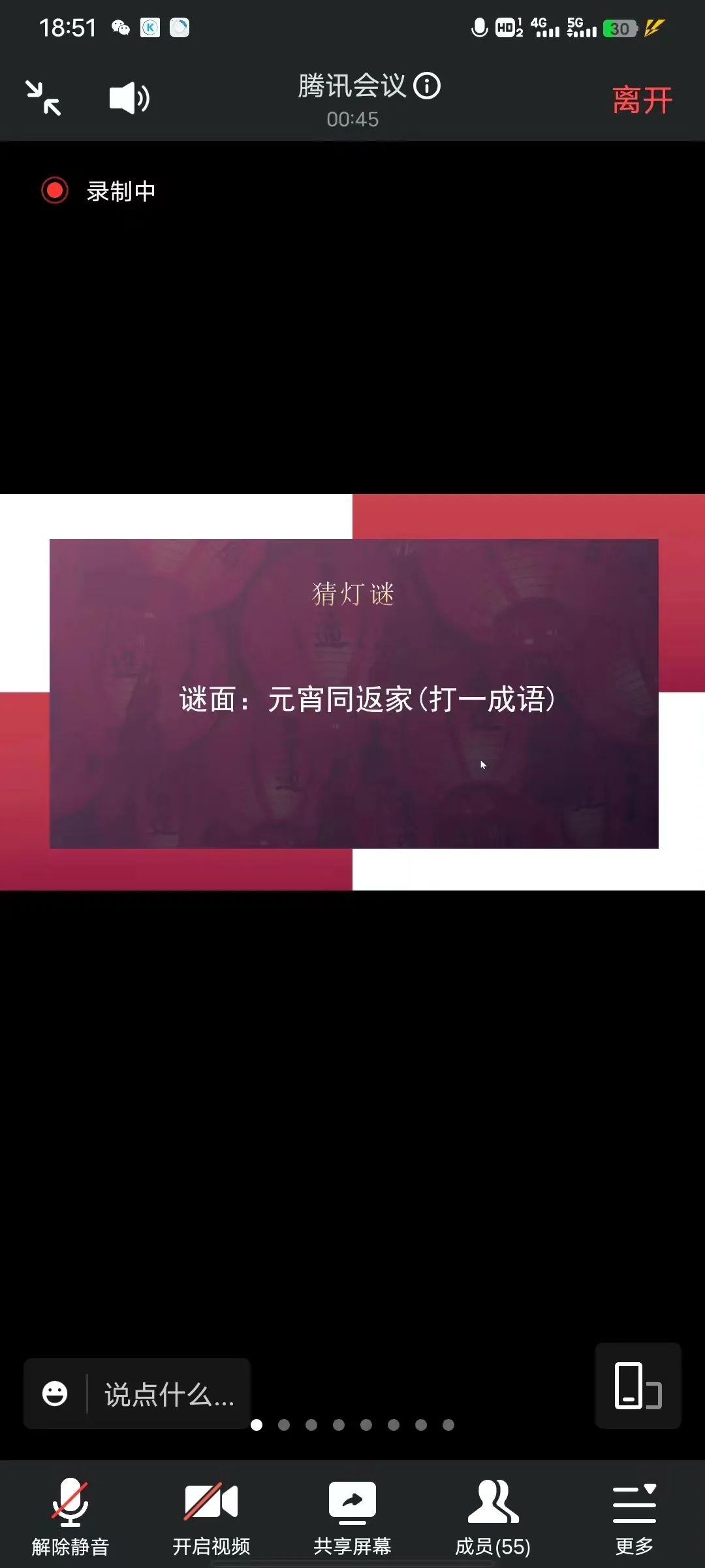 从腾讯会议抢答飞花令、猜灯谜到投稿分享美食与闹元宵的习俗,本次活动内容丰富多样,充分调动了同学们的参与热情!对于当代大学生而言,“弘扬传统节日习俗”不仅仅是口号,更可以从自己做起,从每一次节日做起。本次活动展示了多样的传统习俗,促进更多同学参与进了传统习俗的展示中,体现了学子对中华优秀传统文化的热爱,相信会促进同学们日后更多得参与进传统节日与传统习俗的弘扬中。(文/2204班 侯惠敏 摄/2102班 杨林)