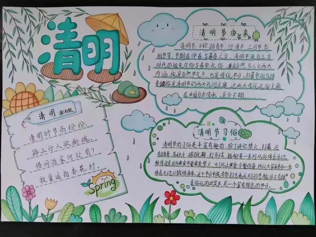 本次活动一共分为中华英烈网为烈士留言、录制主题视频、绘画寄哀思三种形式。同学们在中华英烈网为烈士留言、献花,寄托哀思,不仅是对英烈们的缅怀,更给了同学们启迪和教育。在录制关于清明节的古诗词或关于革命先烈的红色诗篇诵读视频活动中,同学们从中了解了中华优秀传统文化和革命文化,增强文化自信,厚植爱国情怀。此外,同学们还通过绘画或者手抄报等手工作品形式,展现对清明节习俗或革命英烈故事的理解,在感受文化和艺术的同时,激发同学们的爱国情感。
