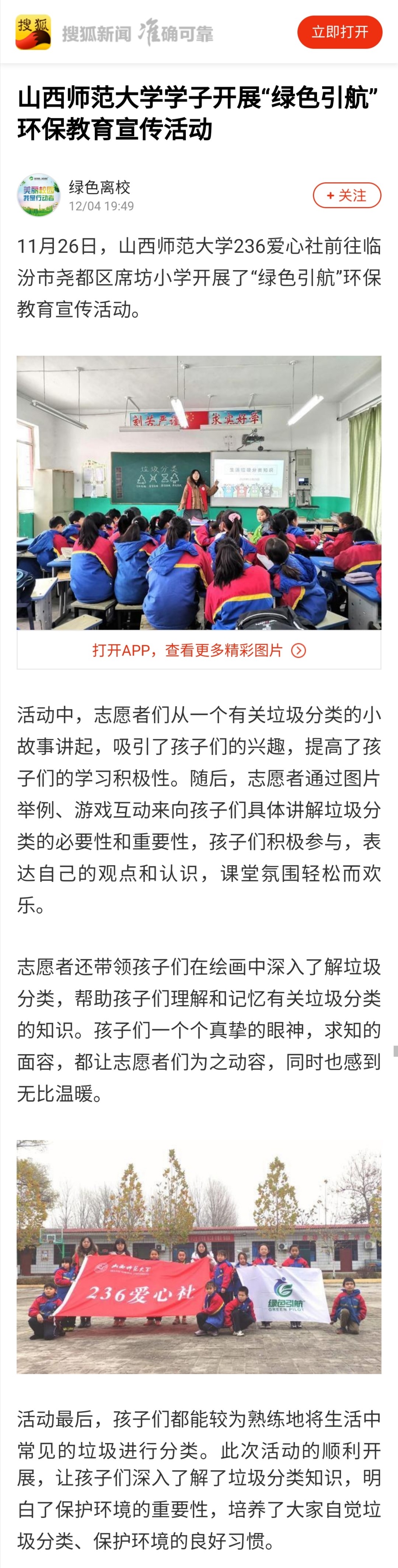 活动中,236爱心社的志愿者们前往临汾市尧都区席坊小学,为孩子们普及垃圾分类的知识。志愿者通过图片举例、游戏互动来向孩子们具体讲解垃圾分类的必要性和重要性,志愿者还带领孩子们在绘画中深入了解垃圾分类,帮助孩子们理解和记忆有关垃圾分类的知识。媒体的报道是对236爱心社关注垃圾分类、践行绿色环保行为的肯定,展现了师大学子的社会责任感和使命感。(文/1903班 张震)