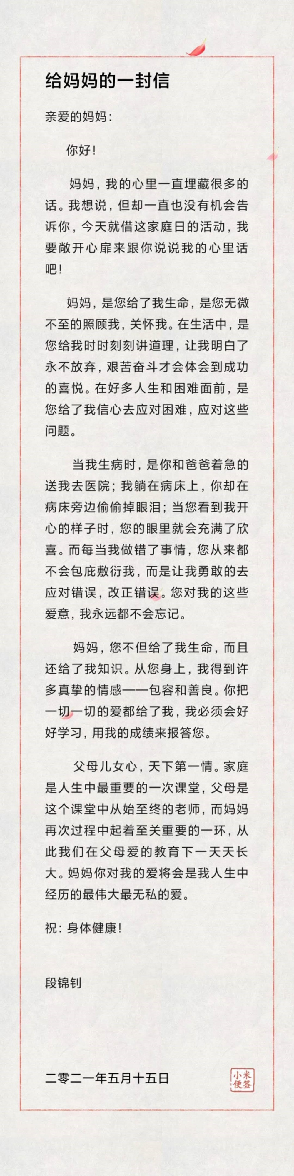 本次活动以弘扬家庭美德,营造和谐的家庭氛围为主要内容,鼓励同学们通过信件、视频等方式与家人沟通交流。活动一经发出就受到同学们的积极响应、踊跃参与。活动期间,同学们或积极与家人分享学习生活中的琐事,或敞开心扉,为自己之前不懂事的行为向父母道歉,或对父母吐露心声,向他们倾诉烦恼、寻求帮助。在与家人的沟通交流中,同学们不仅收获了温暖与感动,更增进了家庭成员间的相互理解与包容。(文/张志飞)