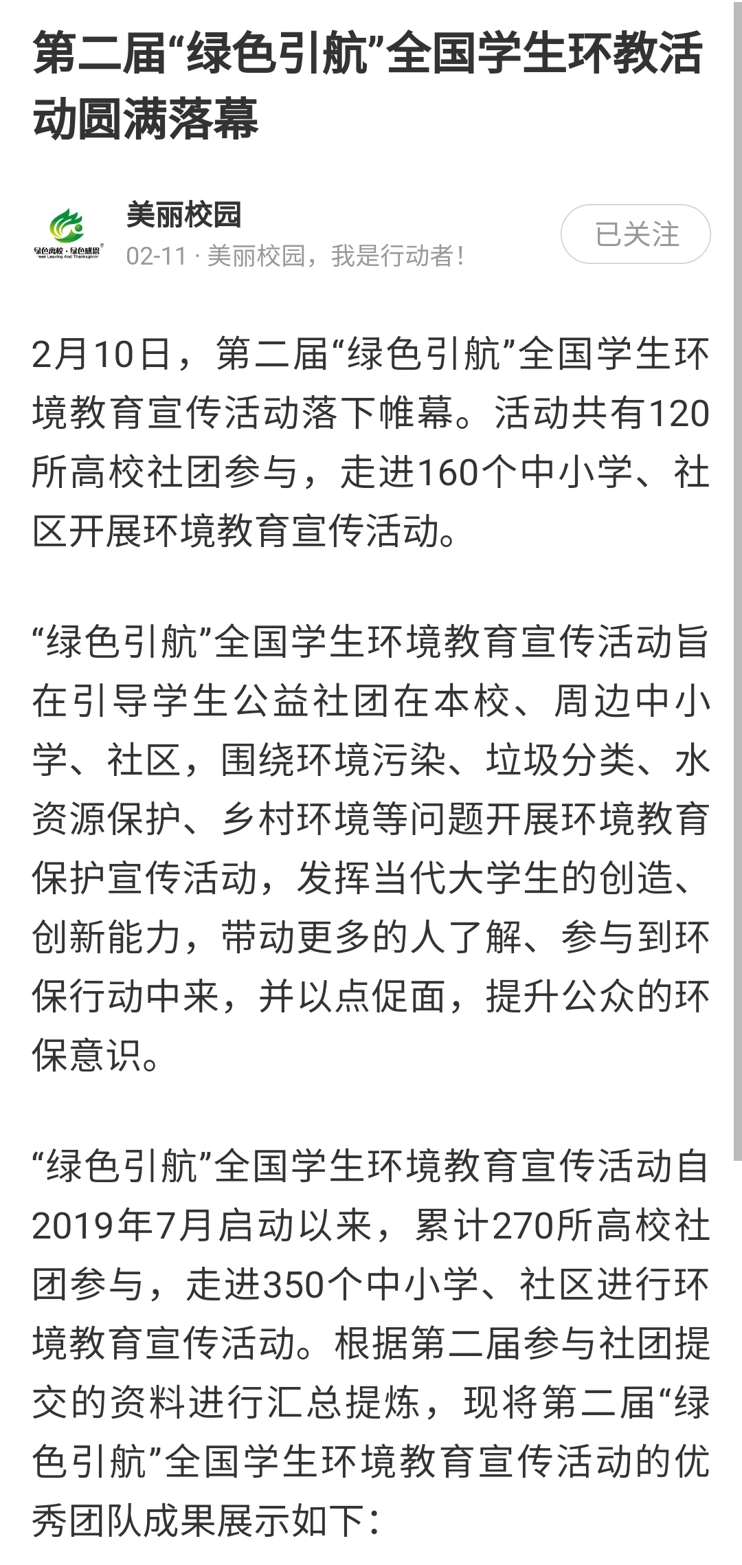 近日,第二届“绿色领航”全国学生环境教育宣传活动落下帷幕,236爱心社被评选为“优秀团队”。