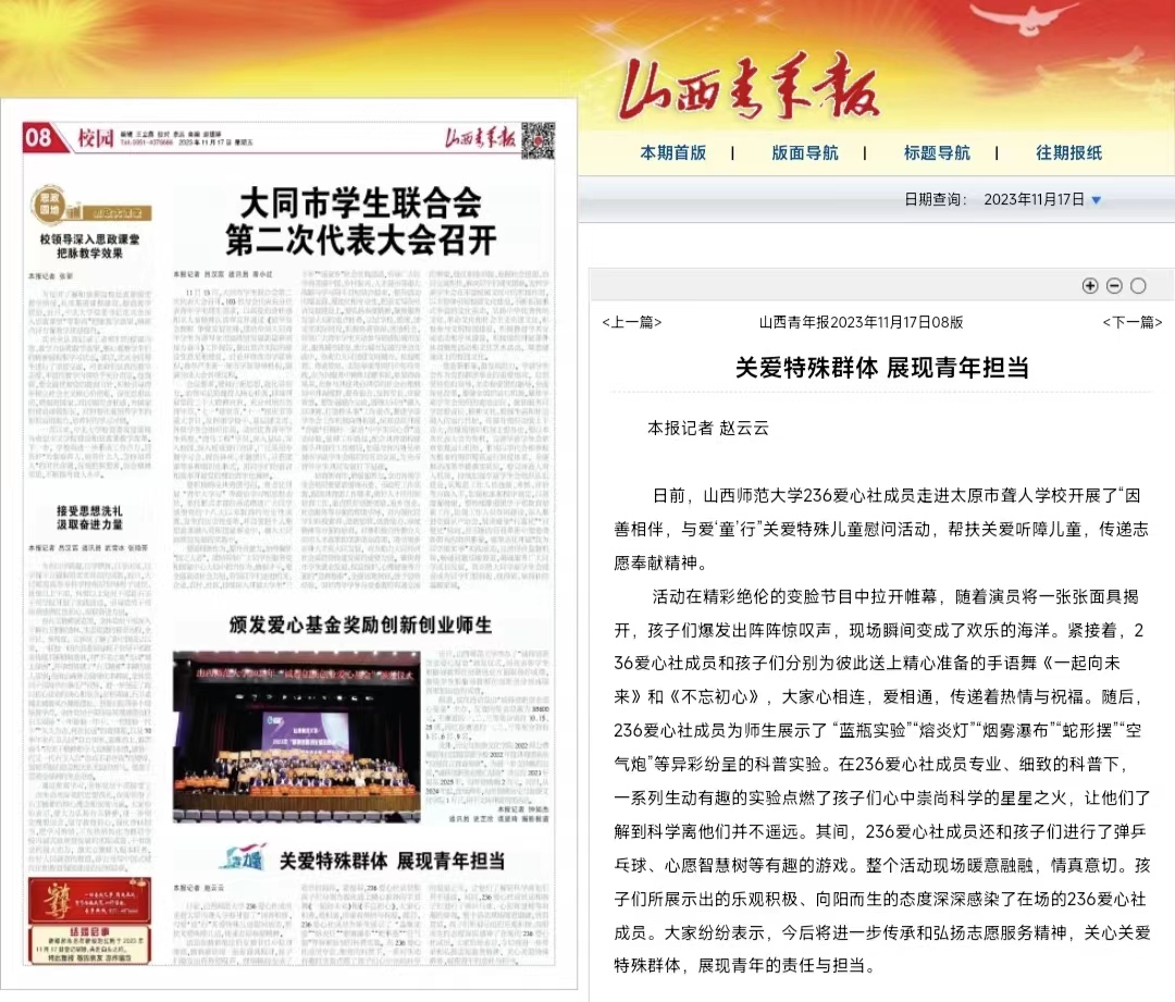 11月17日,《山西青年报》以“关爱特殊群体 展现青年担当”为题,报道了黄色漫画 236爱心社“因善相伴,与爱‘童’行”关爱特殊儿童慰问活动。