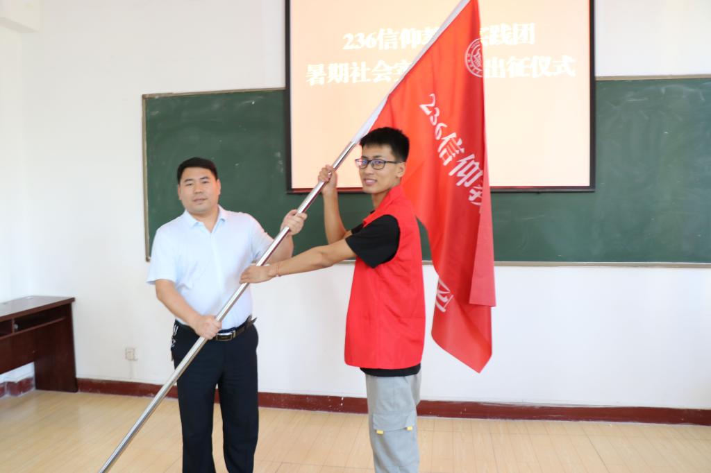 在四号楼二层多功能会议室举行236信仰教育实践团暑期社会实践活动出征仪式。出征仪式由院党委书记陈向波出席,专职辅导员马丽娜和236信仰教育实践团全体成员参加。学生236党支部书记岳文慧主持出征仪式。