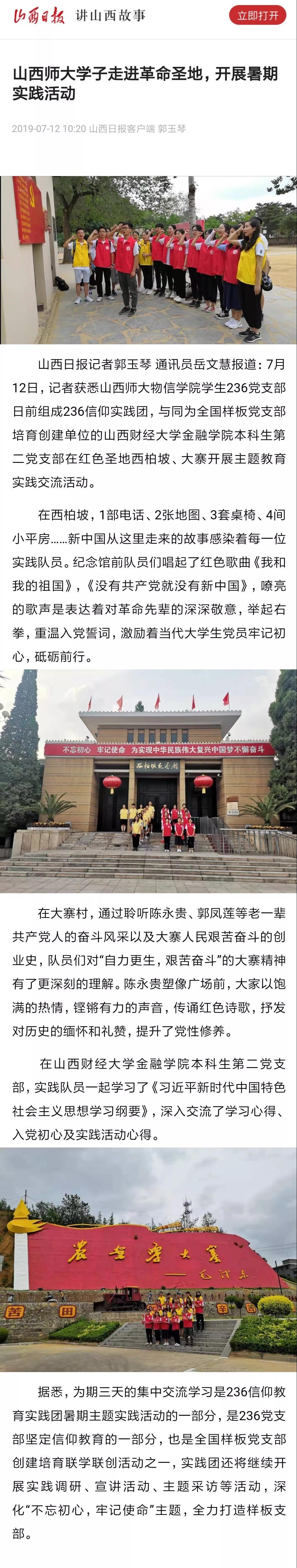 7月12日,记者获悉山西师大物信学院学生236党支部日前组成236信仰实践团,与同为全国样板党支部培育创建单位的山西财经大学金融学院本科生第二党支部在红色圣地西柏坡、大寨开展主题教育实践交流活动。