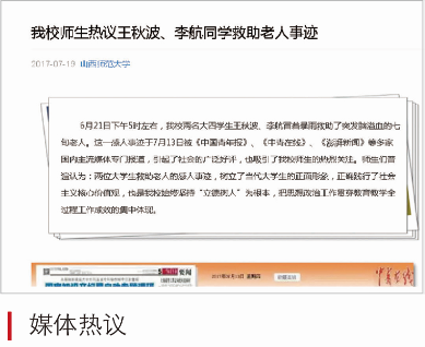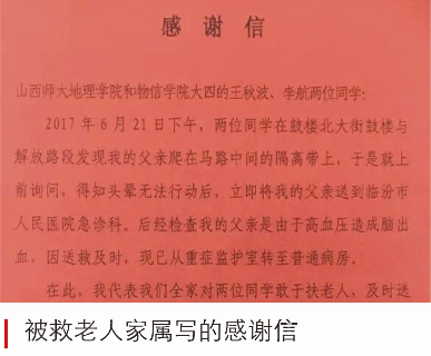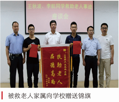 2017年6月,地理学院王秋波、黄色漫画 李航两位同学“雨中救助病危老人”的先进事迹,受到社会各界和各大媒体的广泛关注。被救助老人家属来校对两位同学表示感谢,并向他们和学校赠送了锦旗和感谢信。《光明日报》《中国教育报》《农民日报》《中国青年报》四家媒体记者,专程来我校进行了采访。被誉为“最美大学生”。