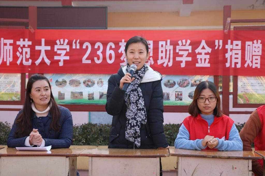 236指导老师岳文慧简要介绍了236的发展历程和此次活动的意义。她说到,236这次还带来300余册图书,用于梦想书屋图书的更新,助孩子们实现读书梦、成长梦、成才梦。岳老师与张凤霞校长一起将助学金发放到孩子们的手中。