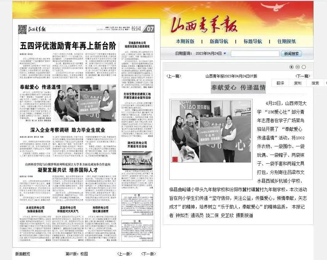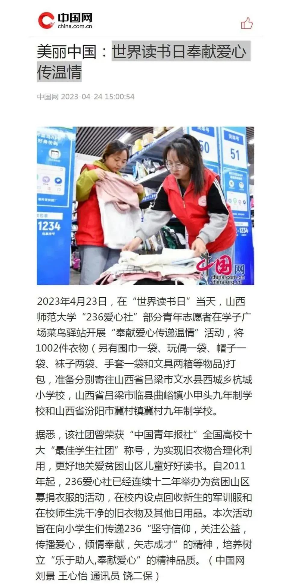 236爱心社青年志愿者在学子广场菜鸟驿站进行爱心捐赠,将一千余件衣物与生活学习用具捐赠给吕梁市文水县西城乡杭城小学校、临县曲峪镇小甲头九年制学校和汾阳市冀村镇冀村九年制学校。志愿者们表示,此次活动的开展,让他们向小学生们送出了温暖,同时为社会做出了贡献。