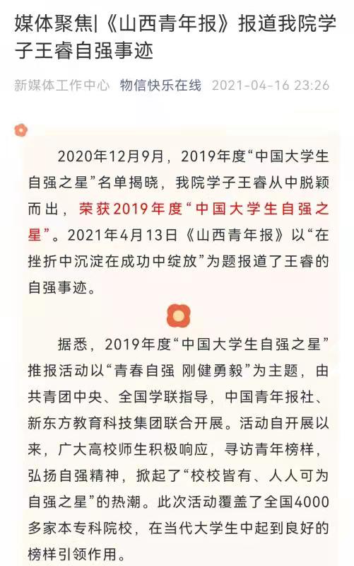 2018级研究生王睿以第一作者的身份在Chemistry of Materials发表了一篇科研成果,且主持了2020年的省级创新项目[2020SY328],荣获2019年度“中国大学生自强之星”,并受到《山西青年报》专题采访报道。被誉为“最美自强者"。