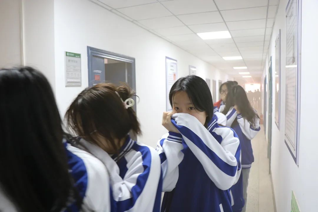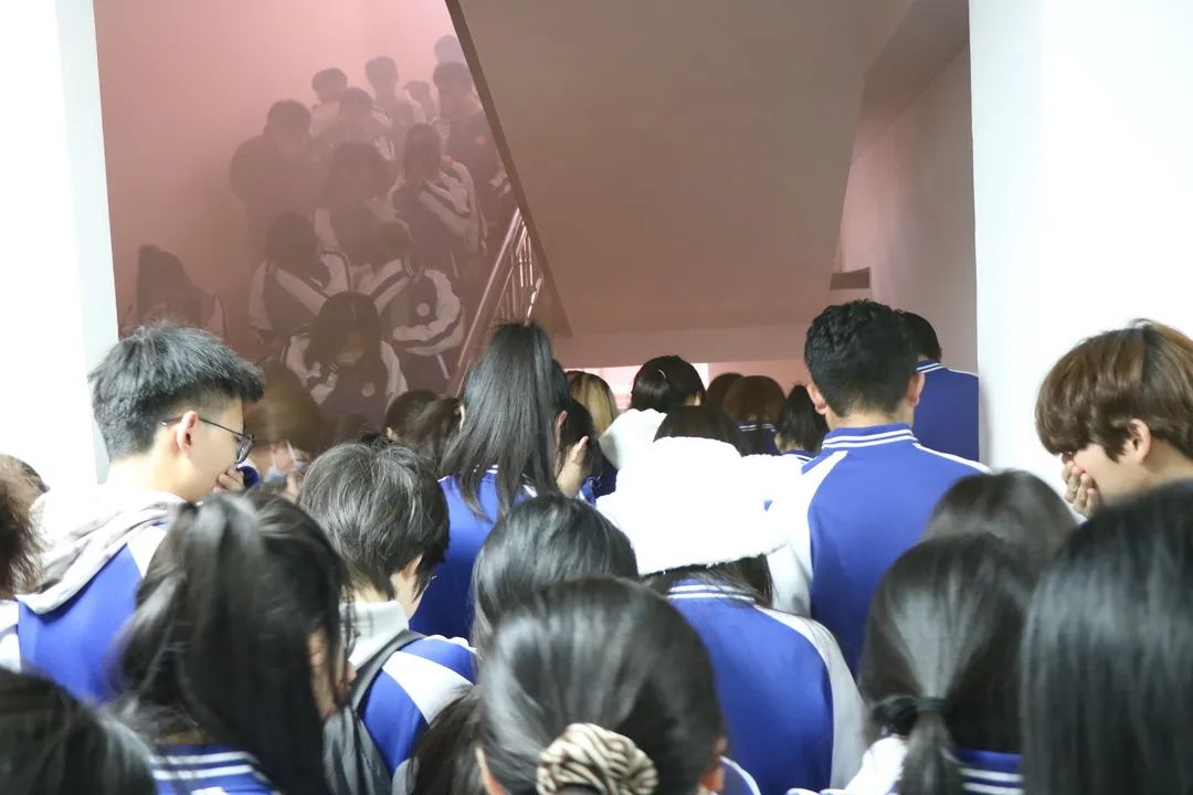 演练开始前,保卫部崔哲老师强调了火灾疏散常识和技巧。随着烟雾弹浓烟弥漫,“滴--滴--”两声哨声响起,消防应急疏散演练正式开始。学生在老师们的引导下,用手帕或衣袖捂住口鼻,弯腰低身,靠墙走,按照预定的疏散路线迅速、安全、有序地撤离到安全地带。
