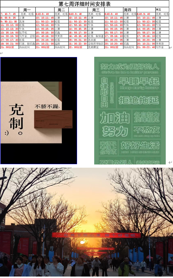 本次活动自开始以来,受到了广大学生的积极参与。大家根据自己的实际情况,制定出切实可行的自律时间表,以培养良好的学习习惯和生活作息。活动期间,同学们纷纷晒出了自己的自律时间表,分享了制定过程中的心得体会。有的同学选择早起晨读,用知识的力量开启新的一天;有的同学则选择晚上自习,将白天的时间用于运动和社交。每个人的时间表都独一无二,但都透露出对自律的执着追求。